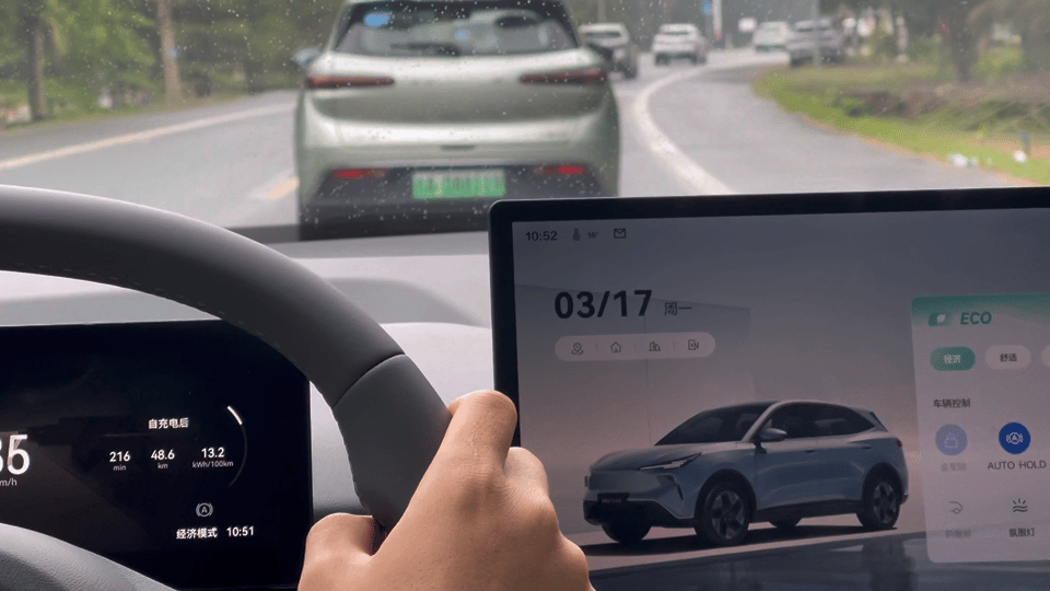 更骚的还得是悦意03的星驰底盘,号称“中国十佳”,实际体验确实能打。海南小城镇的路况懂的都懂,这车经过乡道,过坑像踩棉花,过弯悬架也能稳稳拉住车身。