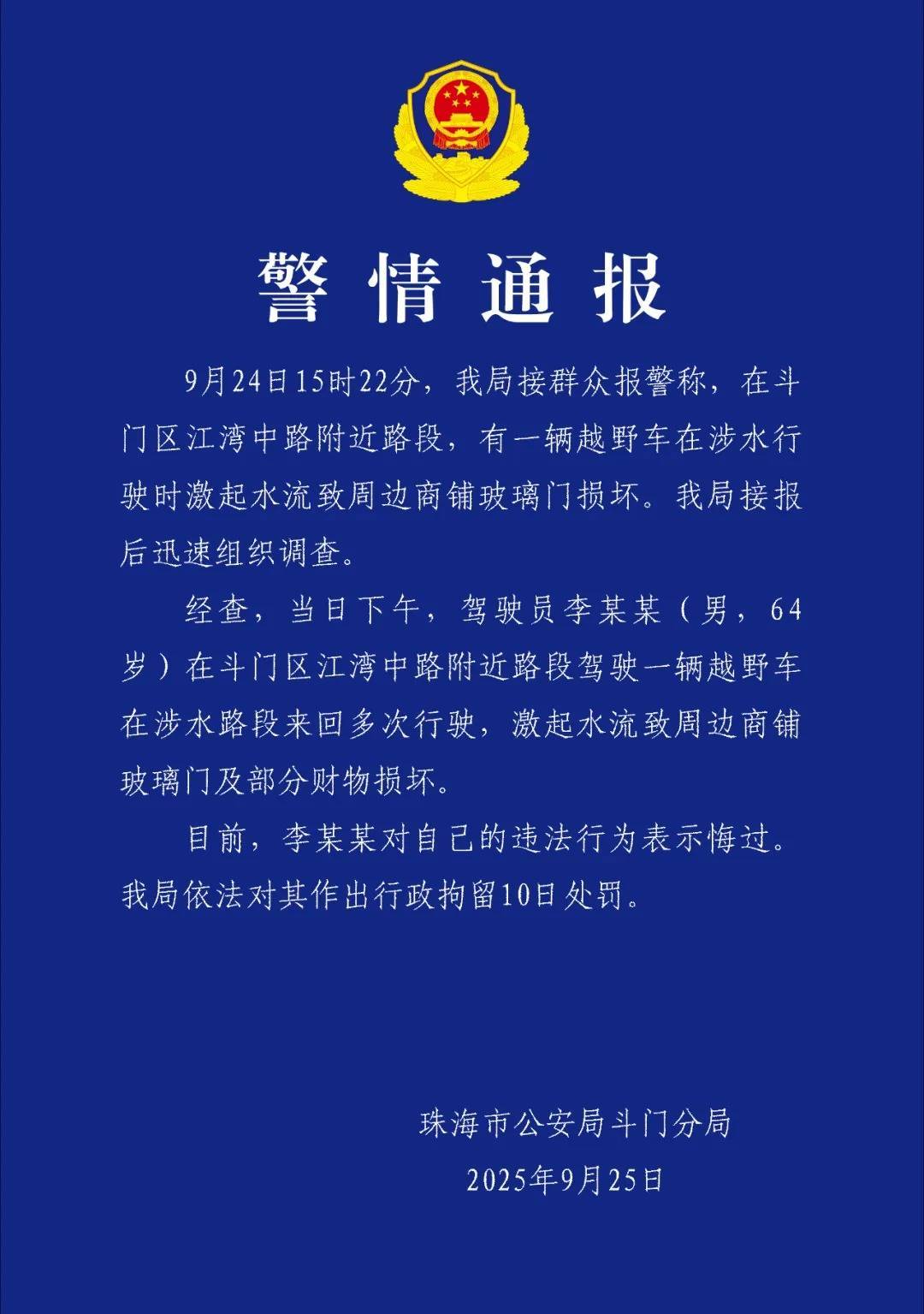 9月24日15时22分,我局接群众报警称,在斗门区江湾中路附近路段,有一辆越野车在涉水行驶时激起水流致周边商铺玻璃门损坏。我局接报后迅速组织调查。