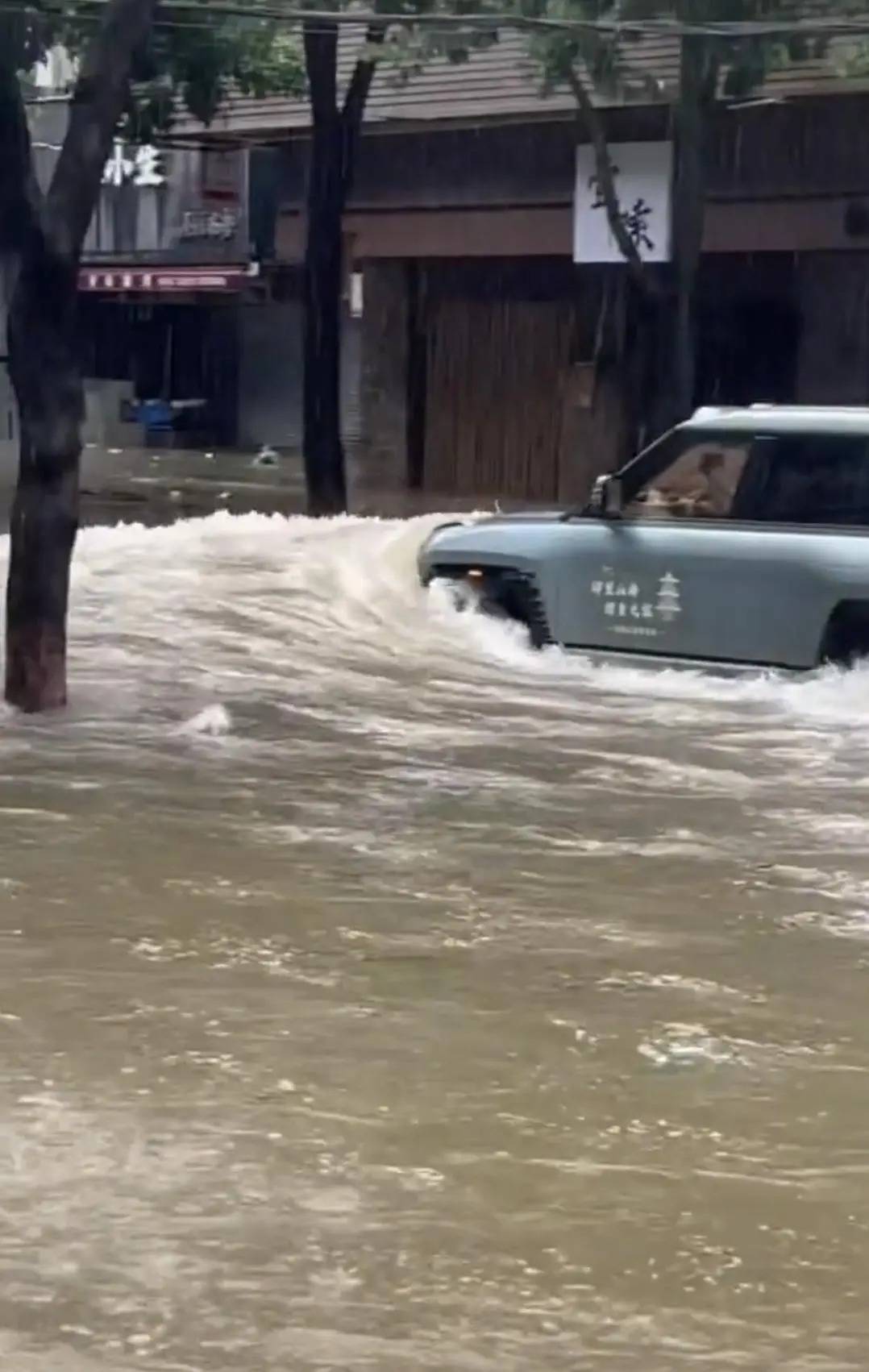 视频显示,上述车辆在行驶时激起水浪,有路人惊呼“海浪”,随后传来玻璃破碎、砸落水中的声音,有店铺卷闸门也被水冲至变形。有人上前拦截车主,指责其“在那摇来摇去三次了。”
